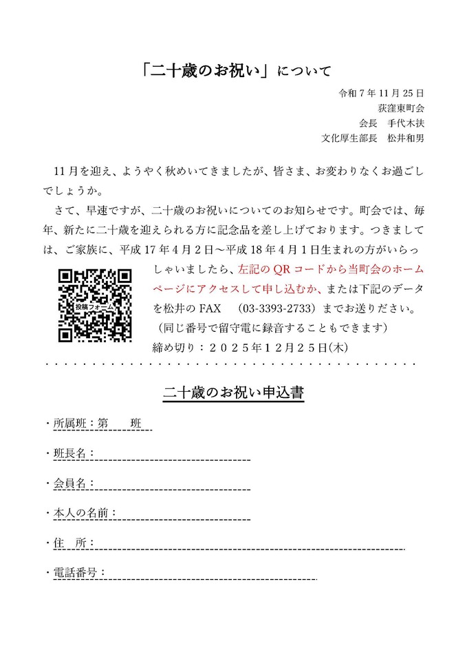 11月を迎え、ようやく秋めいてきましたが、皆さま、お変わりなくお過ごしでしょうか。さて、早速ですが、二十歳のお祝いについてのお知らせです。町会では、毎年、新たに二十歳を迎えられる方に記念品を差し上げております。つきましては、ご家族に、平成17年4月2日~平成18年4月1日生まれの方がいらっしゃいましたら、左記のQRコードから当町会のホームページにアクセスして申し込むか、または下記のデータを松井のFAX (03-3393-2733)までお送りださい。(同じ番号で留守電に録音することもできます)締め切り:2025年12月25日(木)