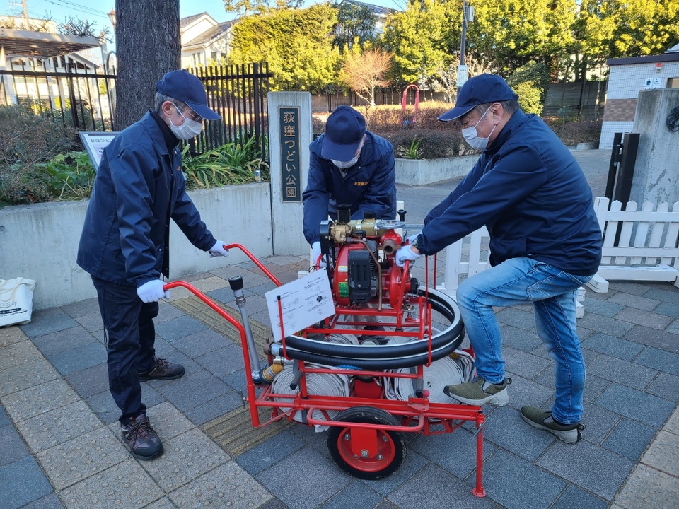 令和8年1月 荻窪東町会・防災部訓練を行いました。 公開日 : 2026-01-25 / 更新日 : 2026-01-26 14. 防火・防災部 1月25日4名参加で大田黒公園及び荻窪つどい公園でエンジン始動ホース接続等の訓練を行いました。 タグ : 防災訓練 「2025年12月25日(木) 荻窪東町会の夜間パトロールを行いました。」