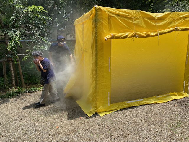 令和5年度 防災・避難訓練を行いました。・ 公開日 : 2023-06-25 / 更新日 : 2023-11-09 14. 防火・防災部 令和5年6月25日午前10時から大田黒公園催し物広場で梅雨の晴れ間で暑い日曜日、荻窪消防署から2名来ていただき、荻窪東町会の防災訓練を行いました。 箱田会長挨拶 荻窪消防署の方から、消火器の使い方の説明を受けて 実際に消火器での消火訓練を水を使って行いました。 D級ポンプを使って大田黒公園催し物広場にある防火水槽から給水して、 実際に放水を行いました。 D級ポンプの製造が中止になっているため交換部品の在庫も少なってくるので、これからはスタンドパイプを使えるようにしていってほしいとのお話しでした。 区内には善福寺川もあるので水害に備えて土嚢の積み方も教えていただきました。 煙体験も行い 簡易トイレにも実際入って頂きました。 大規模災害があっても慌てないように行動しましょう! タグ : 防災・避難訓練 「令和5年9月 荻窪東町会・防災部訓練を行いました。」 「令和5年5月 荻窪東町会・防災部訓練を行いました。」